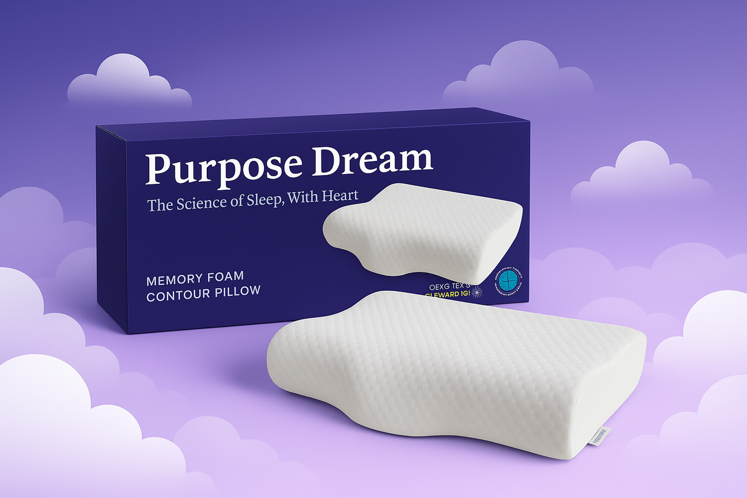 The Purpose™ Pillow is a scientifically designed, contoured memory foam pillow that supports your neck, aligns your spine, and relieves pressure — so you wake up pain-free and well-rested. It's built with high-density materials and a patented 65° neck panel for true ergonomic support.